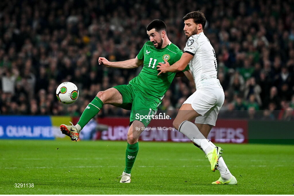 13 November 2025; Finn Azaz of Republic of Ireland in action against Rúben Dias of Portugal during the FIFA World Cup 2026 Group F Qualifier match between Republic of Ireland and Portugal at the Aviva Stadium in Dublin. Photo by Stephen McCarthy/Sportsfile