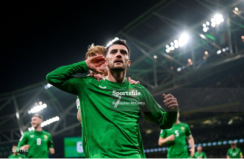 13 November 2025; Troy Parrott of Republic of Ireland celebrates after scoring his side's first goal during the FIFA World Cup 2026 Group F Qualifier match between Republic of Ireland and Portugal at the Aviva Stadium in Dublin. Photo by Stephen McCarthy/Sportsfile
