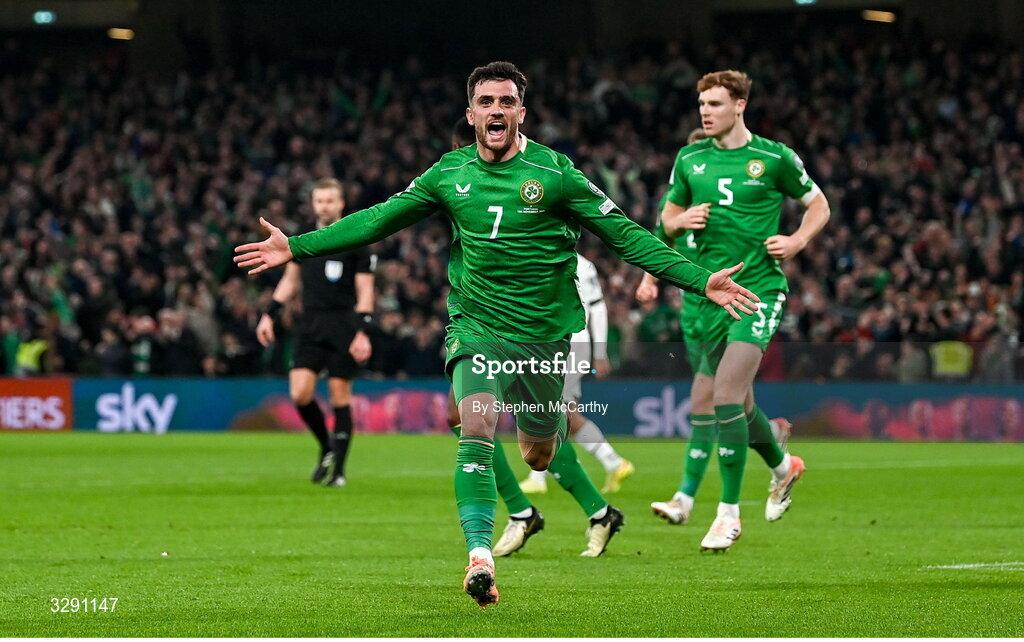 13 November 2025; Troy Parrott of Republic of Ireland celebrates after scoring his side's first goal during the FIFA World Cup 2026 Group F Qualifier match between Republic of Ireland and Portugal at the Aviva Stadium in Dublin. Photo by Stephen McCarthy/Sportsfile