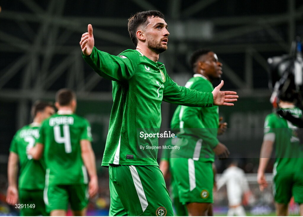 13 November 2025; Troy Parrott of Republic of Ireland celebrates after scoring his side's first goal during the FIFA World Cup 2026 Group F Qualifier match between Republic of Ireland and Portugal at the Aviva Stadium in Dublin. Photo by Stephen McCarthy/Sportsfile