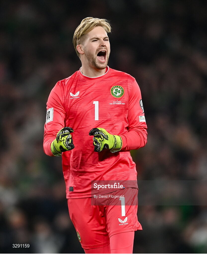 13 November 2025; Republic of Ireland goalkeeper Caoimhin Kelleher celebrates after teammate Troy Parrott, not pictured, scored their side's first goal during the FIFA World Cup 2026 Group F Qualifier match between Republic of Ireland and Portugal at the Aviva Stadium in Dublin. Photo by David Fitzgerald/Sportsfile