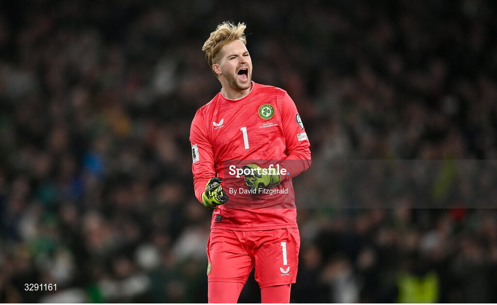 13 November 2025; Republic of Ireland goalkeeper Caoimhin Kelleher celebrates after teammate Troy Parrott, not pictured, scored their side's first goal during the FIFA World Cup 2026 Group F Qualifier match between Republic of Ireland and Portugal at the Aviva Stadium in Dublin. Photo by David Fitzgerald/Sportsfile