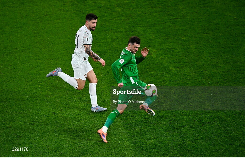 13 November 2025; Troy Parrott of Republic of Ireland in action against Rúben Neves of Portugal during the FIFA World Cup 2026 Group F Qualifier match between Republic of Ireland and Portugal at the Aviva Stadium in Dublin. Photo by Piaras Ó Mídheach/Sportsfile