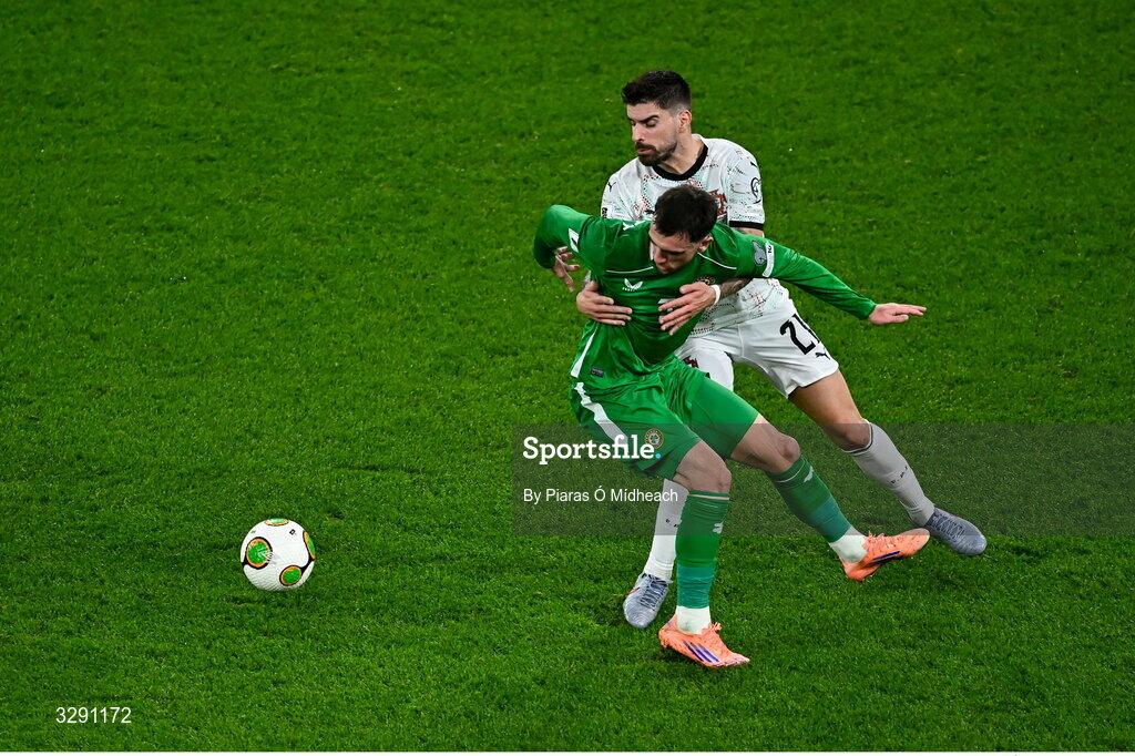 13 November 2025; Troy Parrott of Republic of Ireland is tackled by Rúben Neves of Portugal during the FIFA World Cup 2026 Group F Qualifier match between Republic of Ireland and Portugal at the Aviva Stadium in Dublin. Photo by Piaras Ó Mídheach/Sportsfile