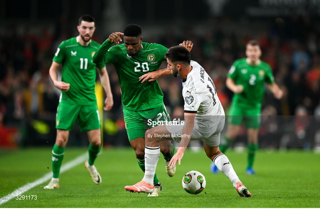 13 November 2025; Chiedozie Ogbene of Republic of Ireland in action against Goncalo Inácio of Portugal during the FIFA World Cup 2026 Group F Qualifier match between Republic of Ireland and Portugal at the Aviva Stadium in Dublin. Photo by Stephen McCarthy/Sportsfile