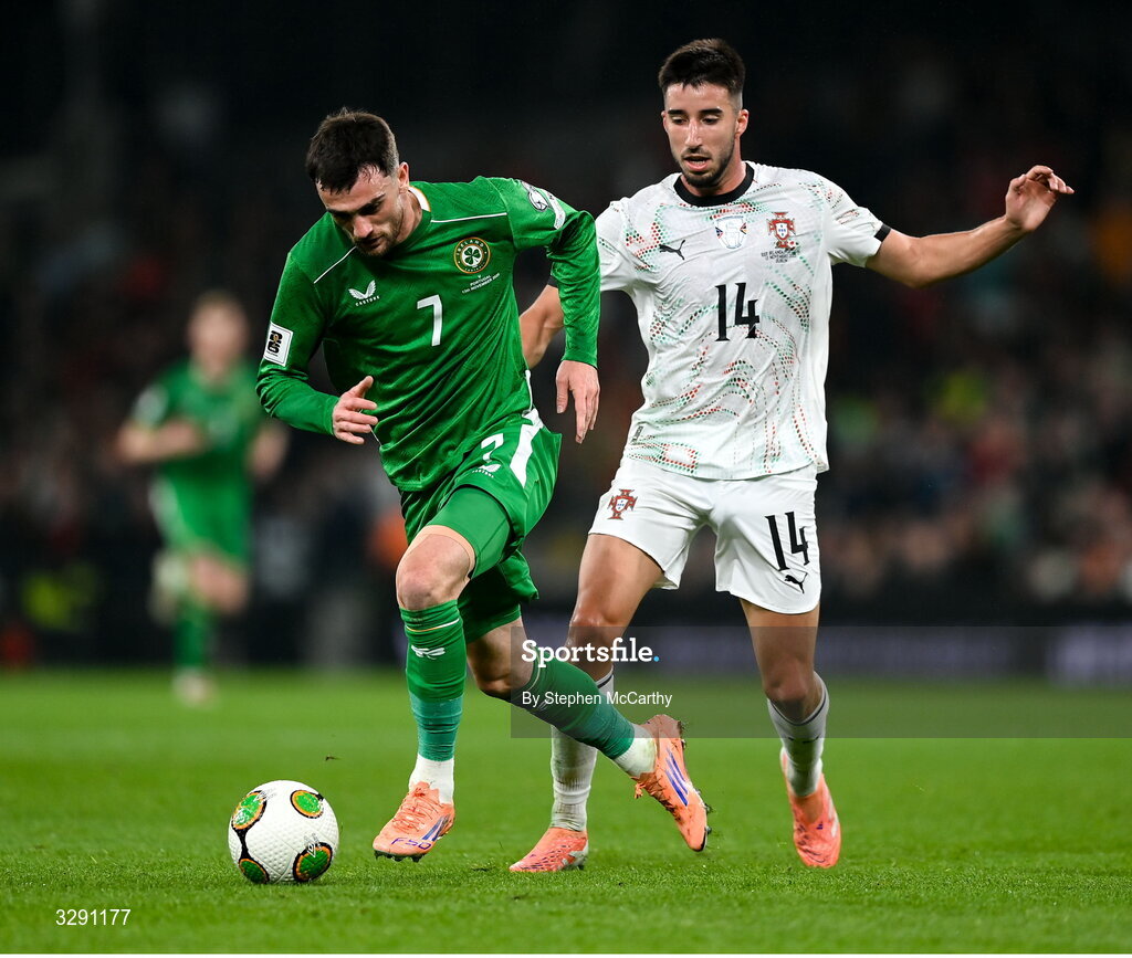 13 November 2025; Troy Parrott of Republic of Ireland in action against Goncalo Inácio of Portugal during the FIFA World Cup 2026 Group F Qualifier match between Republic of Ireland and Portugal at the Aviva Stadium in Dublin. Photo by Stephen McCarthy/Sportsfile
