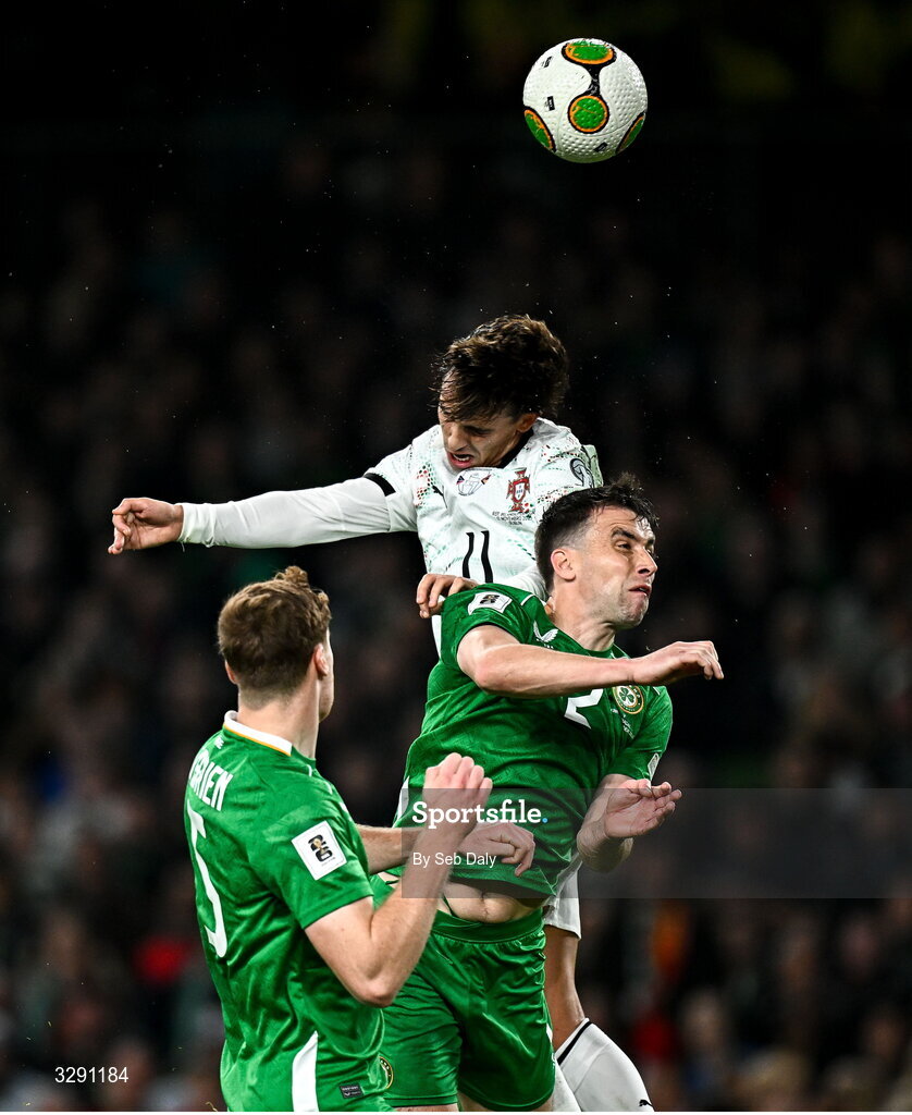 13 November 2025; Joao Félix of Portugal in action against Seamus Coleman and Jake O'Brien of Republic of Ireland during the FIFA World Cup 2026 Qualifier match between Republic of Ireland and Portugal at the Aviva Stadium in Dublin. Photo by Seb Daly/Sportsfile
