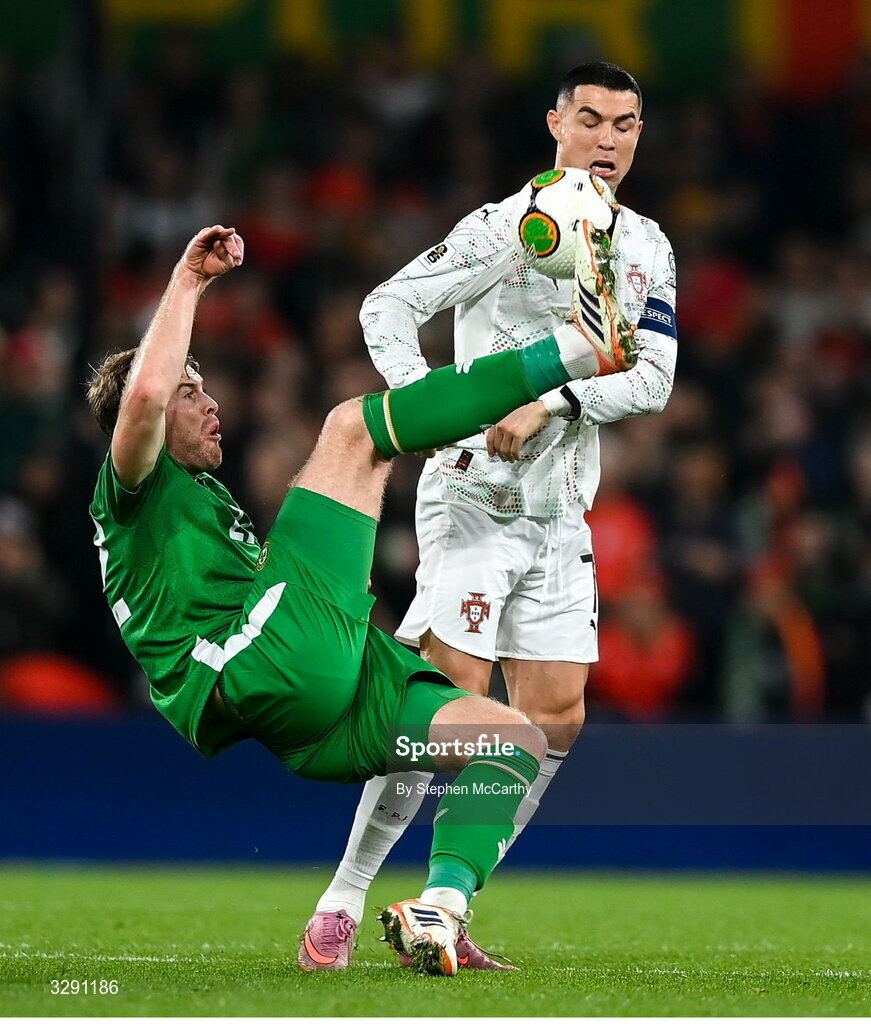 13 November 2025; Cristiano Ronaldo of Portugal in action against Nathan Collins of Republic of Ireland during the FIFA World Cup 2026 Group F Qualifier match between Republic of Ireland and Portugal at the Aviva Stadium in Dublin. Photo by Stephen McCarthy/Sportsfile