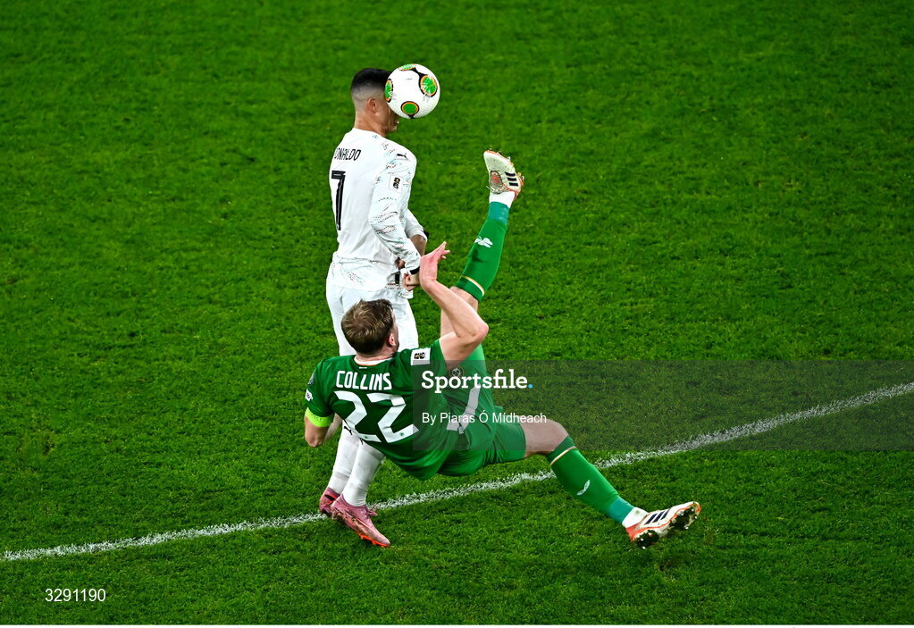 13 November 2025; Cristiano Ronaldo of Portugal in action against Nathan Collins of Republic of Ireland during the FIFA World Cup 2026 Group F Qualifier match between Republic of Ireland and Portugal at the Aviva Stadium in Dublin. Photo by Piaras Ó Mídheach/Sportsfile