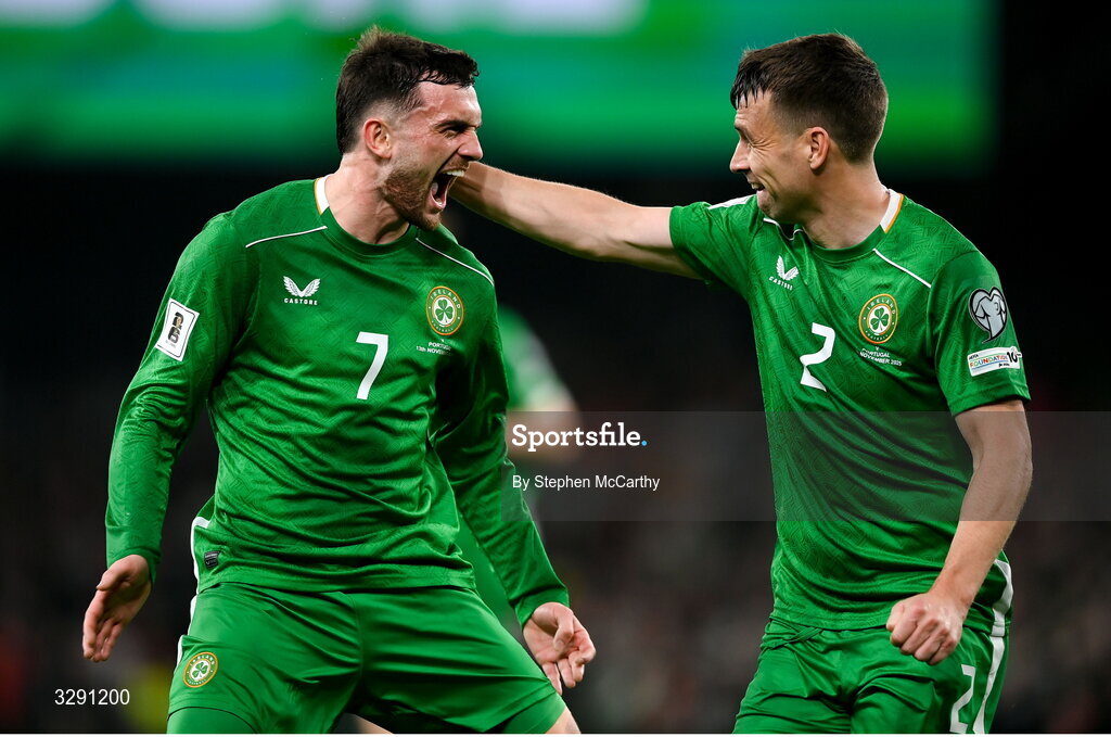 13 November 2025; Troy Parrott of Republic of Ireland, left, celebrates with captain Seamus Coleman after scoring their side's second goal during the FIFA World Cup 2026 Group F Qualifier match between Republic of Ireland and Portugal at the Aviva Stadium in Dublin. Photo by Stephen McCarthy/Sportsfile