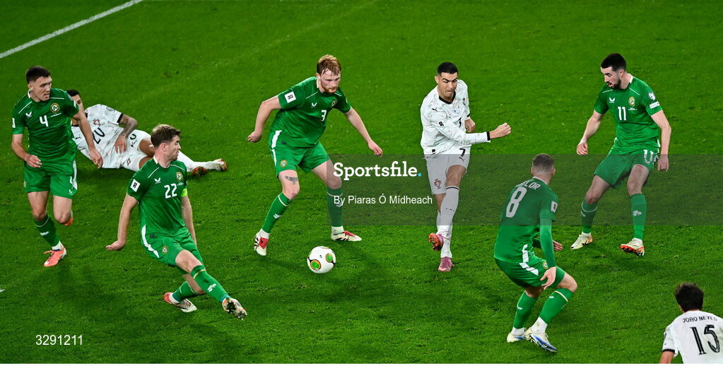 13 November 2025; Cristiano Ronaldo of Portugal in action against Republic of Ireland players, from left, Dara O'Shea, Nathan Collins, Liam Scales, Jack Taylor and Finn Azaz during the FIFA World Cup 2026 Group F Qualifier match between Republic of Ireland and Portugal at the Aviva Stadium in Dublin. Photo by Piaras Ó Mídheach/Sportsfile