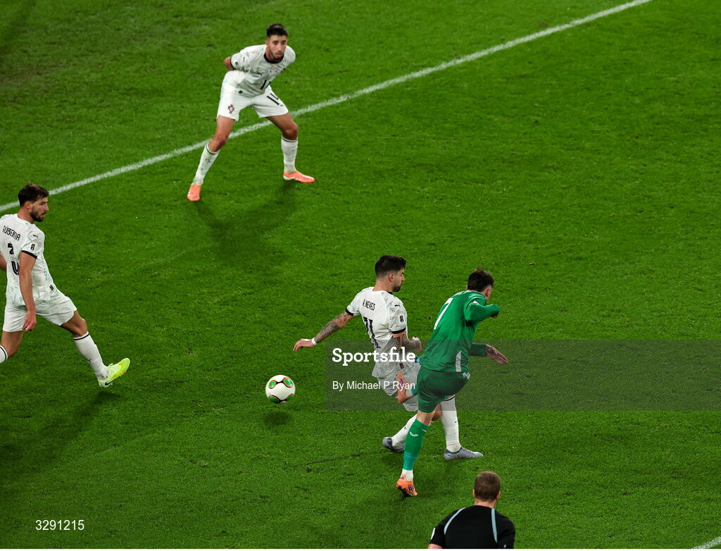 13 November 2025; Troy Parrott of Republic of Ireland shoots to score his side's second goal during the FIFA World Cup 2026 Group F Qualifier match between Republic of Ireland and Portugal at the Aviva Stadium in Dublin. Photo by Michael P Ryan/Sportsfile