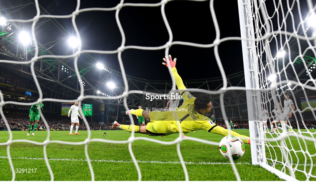 13 November 2025; Portugal goalkeeper Diogo Costa fails to save a shot by Troy Parrott of Republic of Ireland for the Republic of Ireland's second goal during the FIFA World Cup 2026 Group F Qualifier match between Republic of Ireland and Portugal at the Aviva Stadium in Dublin. Photo by Stephen McCarthy/Sportsfile