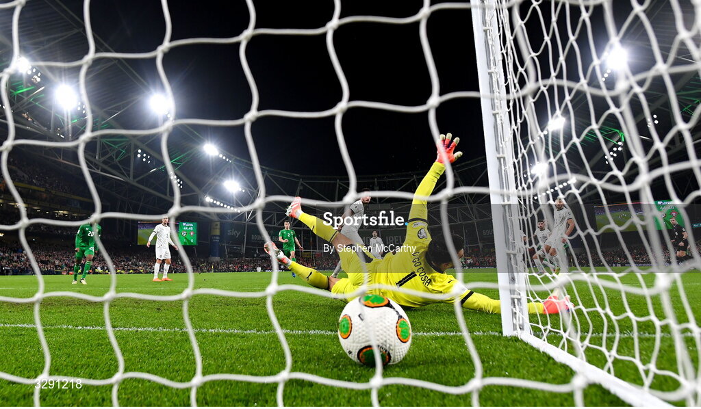 13 November 2025; Portugal goalkeeper Diogo Costa fails to save a shot by Troy Parrott of Republic of Ireland for the Republic of Ireland's second goal during the FIFA World Cup 2026 Group F Qualifier match between Republic of Ireland and Portugal at the Aviva Stadium in Dublin. Photo by Stephen McCarthy/Sportsfile