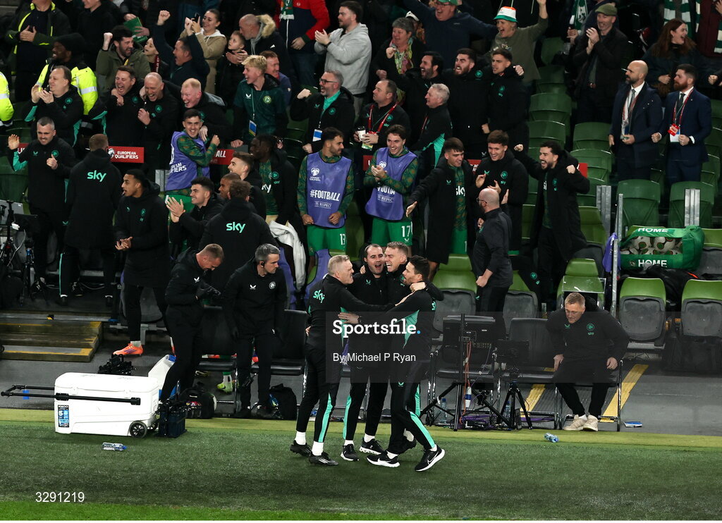 13 November 2025; The Republic of Ireland backroom staff including John O'Shea celebrate their sides second goal during the FIFA World Cup 2026 Group F Qualifier match between Republic of Ireland and Portugal at the Aviva Stadium in Dublin. Photo by Michael P Ryan/Sportsfile