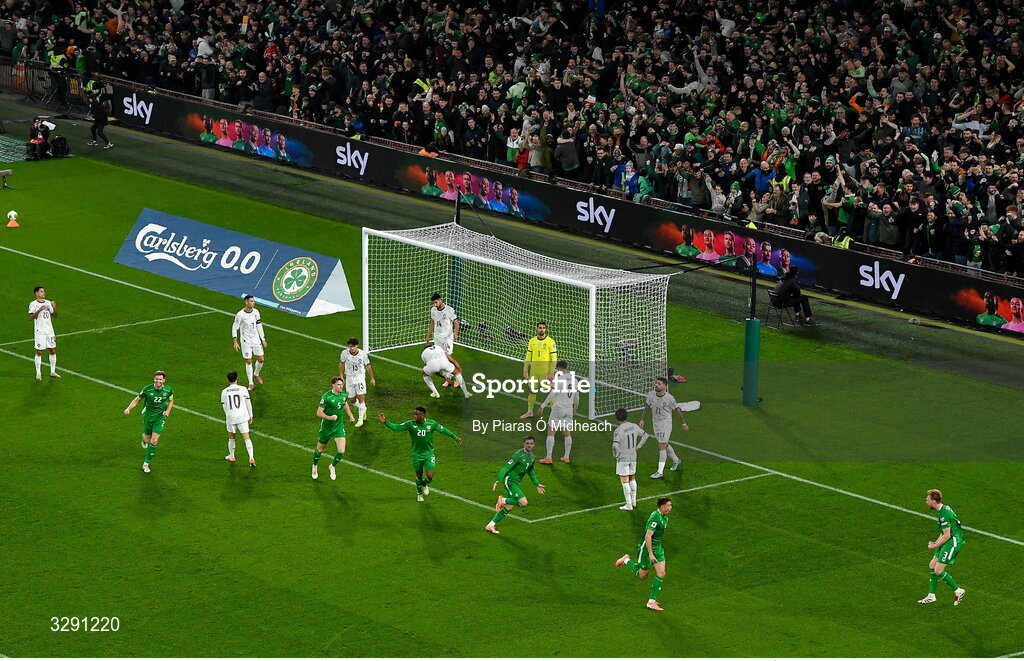13 November 2025; Troy Parrott of Republic of Ireland, 7, celebrates after scoring his side's first goal during the FIFA World Cup 2026 Group F Qualifier match between Republic of Ireland and Portugal at the Aviva Stadium in Dublin. Photo by Piaras Ó Mídheach/Sportsfile