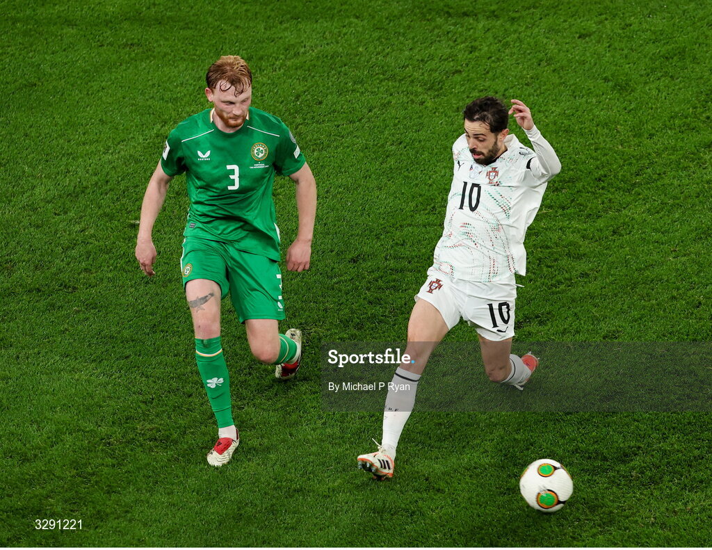 13 November 2025; Liam Scales of Republic of Ireland in action against Bernardo Silva of Portugal during the FIFA World Cup 2026 Group F Qualifier match between Republic of Ireland and Portugal at the Aviva Stadium in Dublin. Photo by Michael P Ryan/Sportsfile