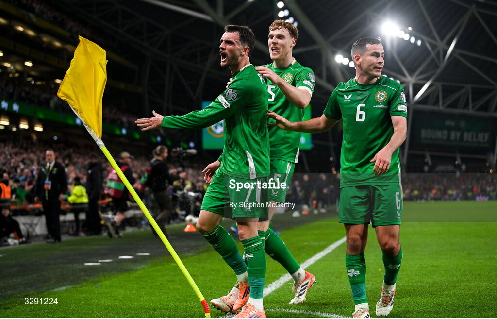 13 November 2025; Troy Parrott of Republic of Ireland, left, celebrates with teammates after scoring his side's second goal during the FIFA World Cup 2026 Group F Qualifier match between Republic of Ireland and Portugal at the Aviva Stadium in Dublin. Photo by Stephen McCarthy/Sportsfile