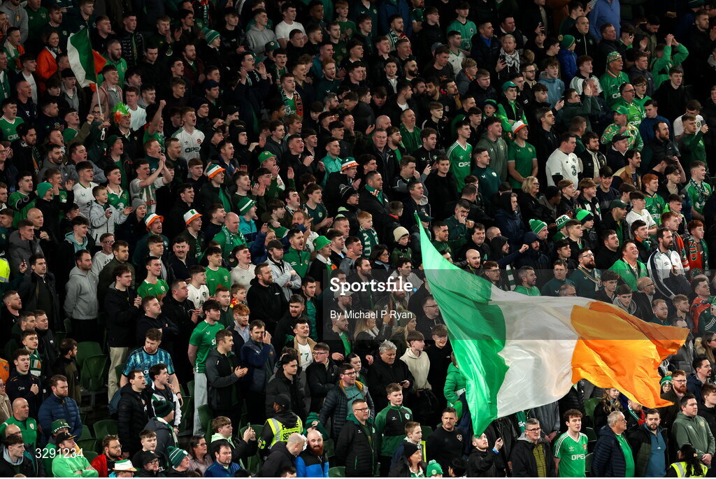 13 November 2025; Republic of Ireland supporters during the FIFA World Cup 2026 Group F Qualifier match between Republic of Ireland and Portugal at the Aviva Stadium in Dublin. Photo by Michael P Ryan/Sportsfile