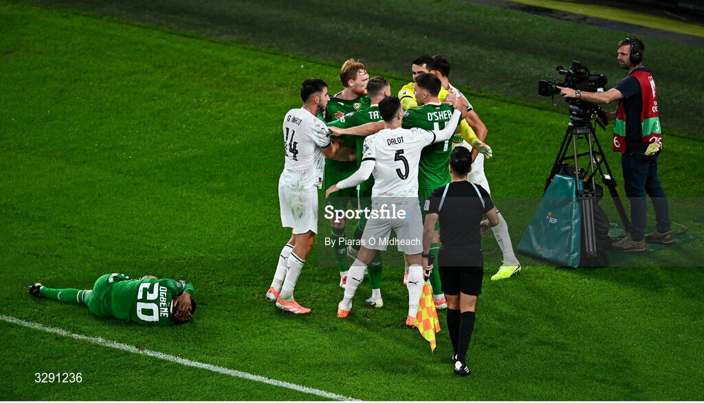13 November 2025; Players from both side tussle after Republic of Ireland scored their second goal during the FIFA World Cup 2026 Group F Qualifier match between Republic of Ireland and Portugal at the Aviva Stadium in Dublin. Photo by Piaras Ó Mídheach/Sportsfile