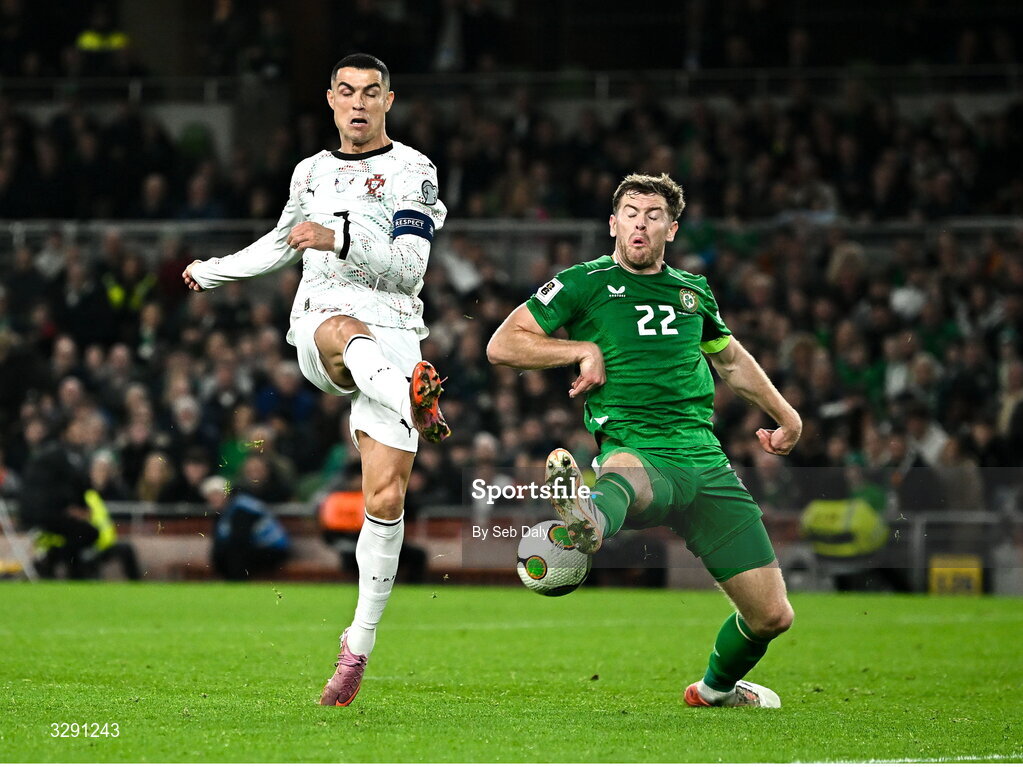 13 November 2025; Cristiano Ronaldo of Portugal has a shot blocked by Nathan Collins of Republic of Ireland during the FIFA World Cup 2026 Qualifier match between Republic of Ireland and Portugal at the Aviva Stadium in Dublin. Photo by Seb Daly/Sportsfile