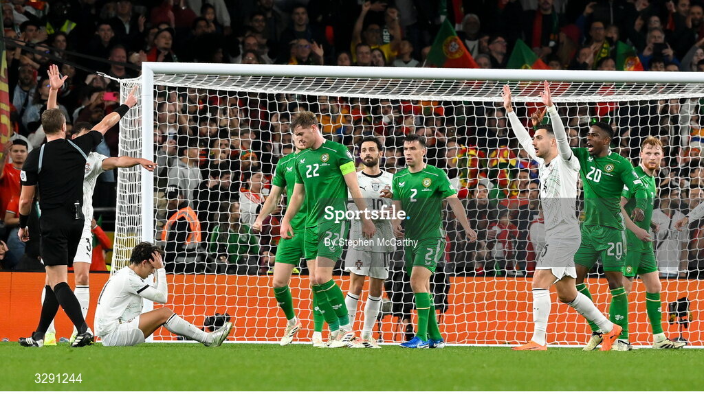13 November 2025; Diogo Dalot of Portugal appeal for a handball during the FIFA World Cup 2026 Group F Qualifier match between Republic of Ireland and Portugal at the Aviva Stadium in Dublin. Photo by Stephen McCarthy/Sportsfile