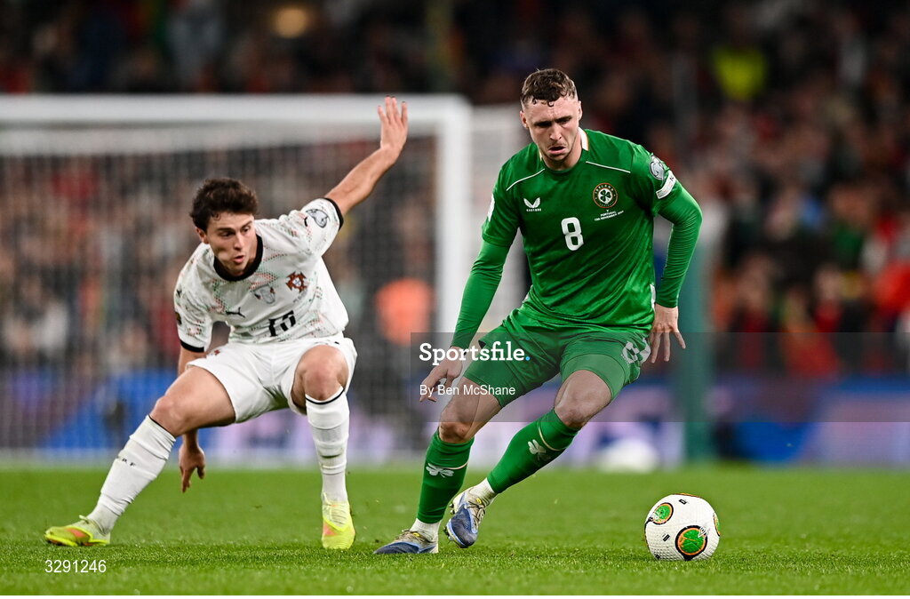 13 November 2025; Jack Taylor of Republic of Ireland in action against Joao Neves of Portugal during the FIFA World Cup 2026 Group F Qualifier match between Republic of Ireland and Portugal at the Aviva Stadium in Dublin. Photo by Ben McShane/Sportsfile