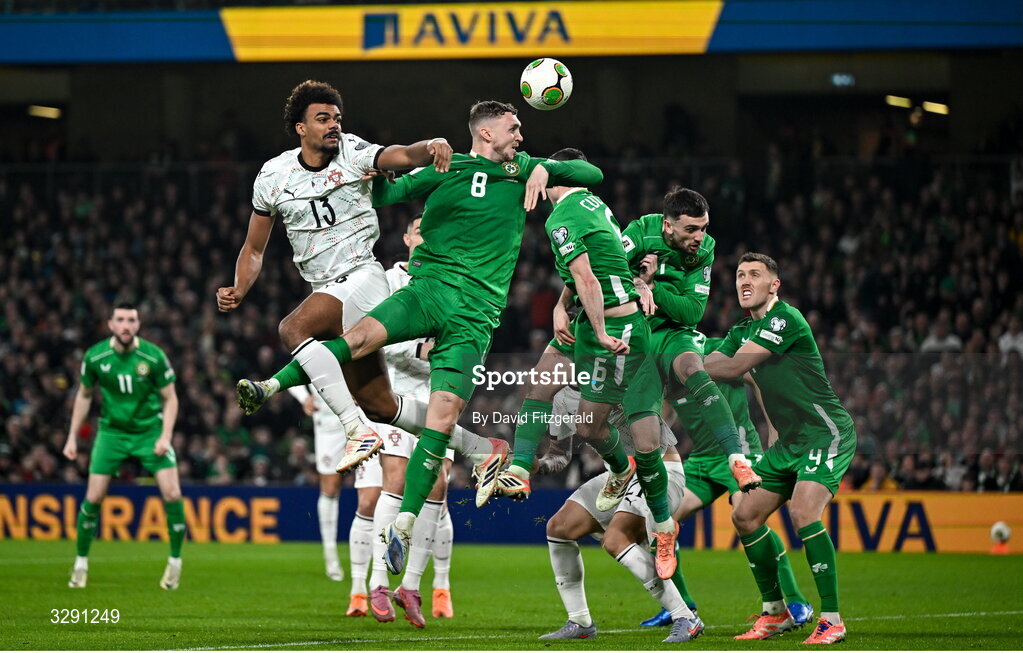 13 November 2025; Jack Taylor of Republic of Ireland in action against Renato Veiga of Portugal during the FIFA World Cup 2026 Group F Qualifier match between Republic of Ireland and Portugal at the Aviva Stadium in Dublin. Photo by David Fitzgerald/Sportsfile