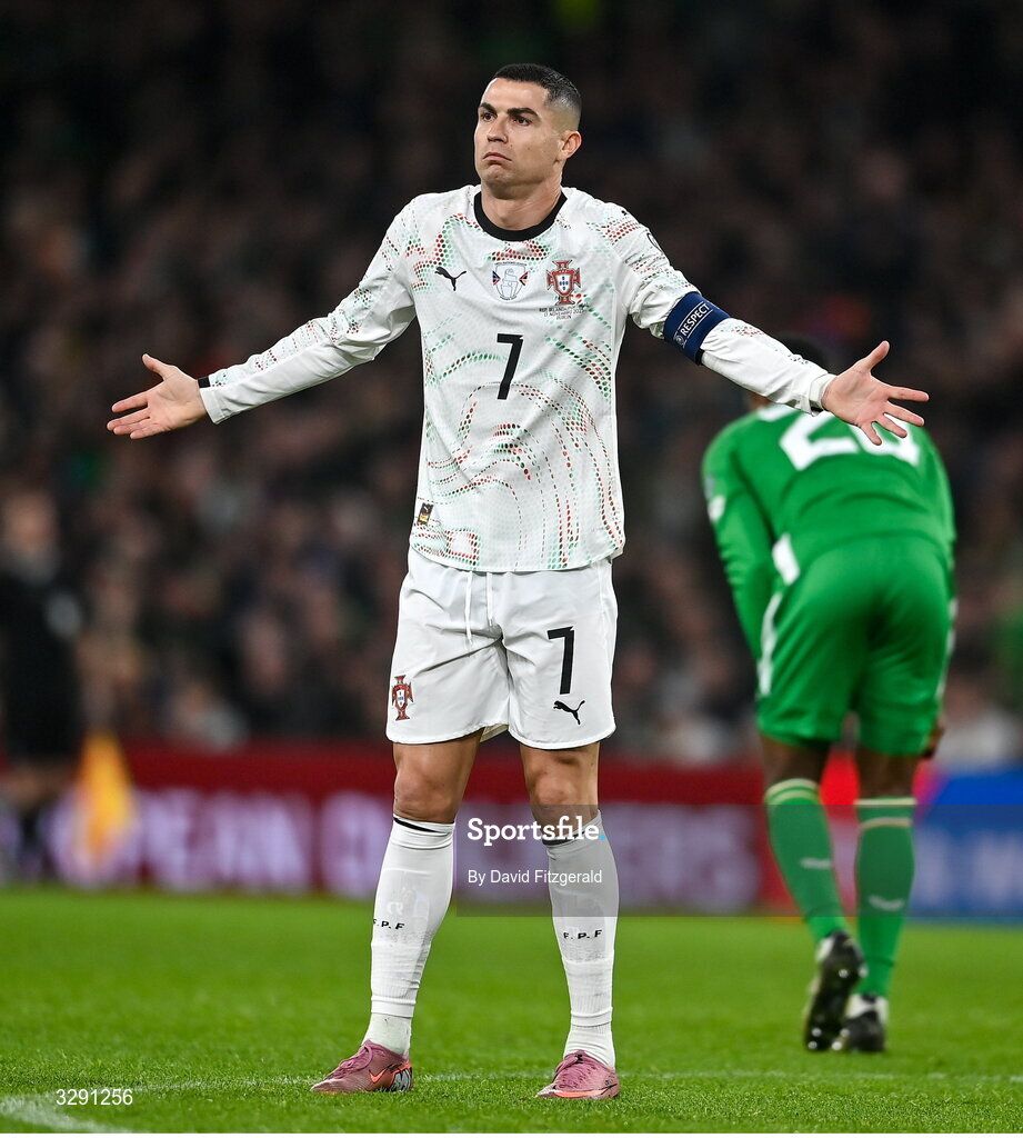 13 November 2025; Cristiano Ronaldo of Portugal reacts before being shown a red card during the FIFA World Cup 2026 Group F Qualifier match between Republic of Ireland and Portugal at the Aviva Stadium in Dublin. Photo by David Fitzgerald/Sportsfile
