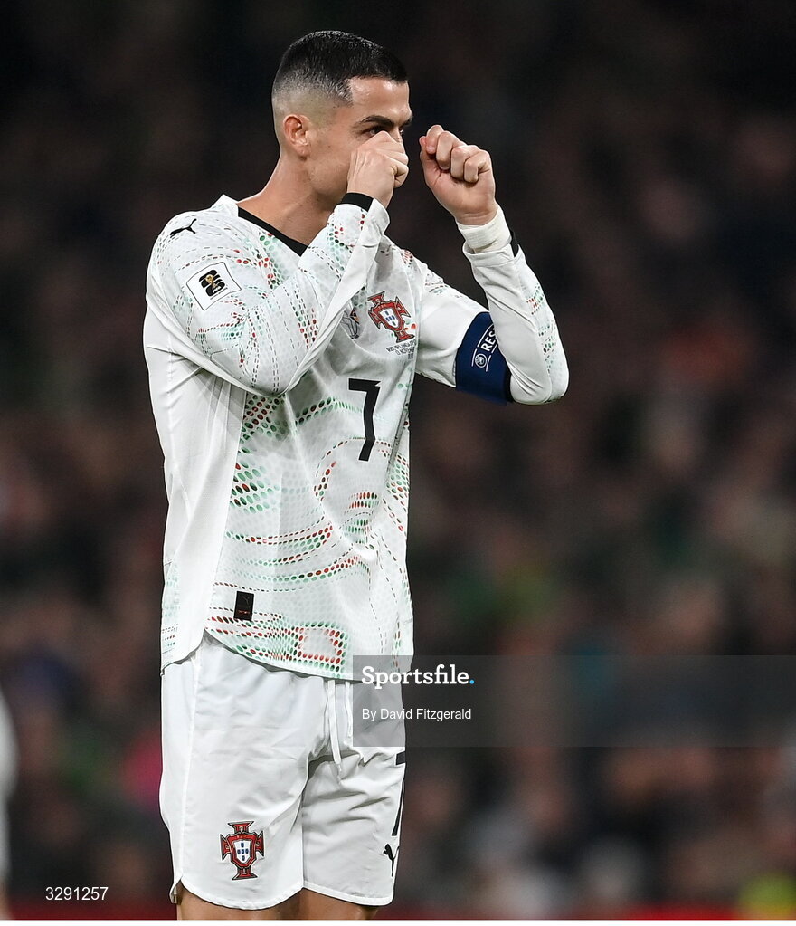 13 November 2025; Cristiano Ronaldo of Portugal gestures towards Dara O'Shea of Republic of Ireland, not pictured, after they tangled, resulting in a red card for Cristiano Ronaldo during the FIFA World Cup 2026 Group F Qualifier match between Republic of Ireland and Portugal at the Aviva Stadium in Dublin. Photo by David Fitzgerald/Sportsfile