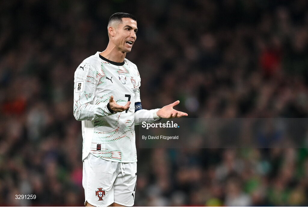 13 November 2025; Cristiano Ronaldo of Portugal gestures towards Dara O'Shea of Republic of Ireland, not pictured, after they tangled, resulting in a red card for Cristiano Ronaldo during the FIFA World Cup 2026 Group F Qualifier match between Republic of Ireland and Portugal at the Aviva Stadium in Dublin. Photo by David Fitzgerald/Sportsfile