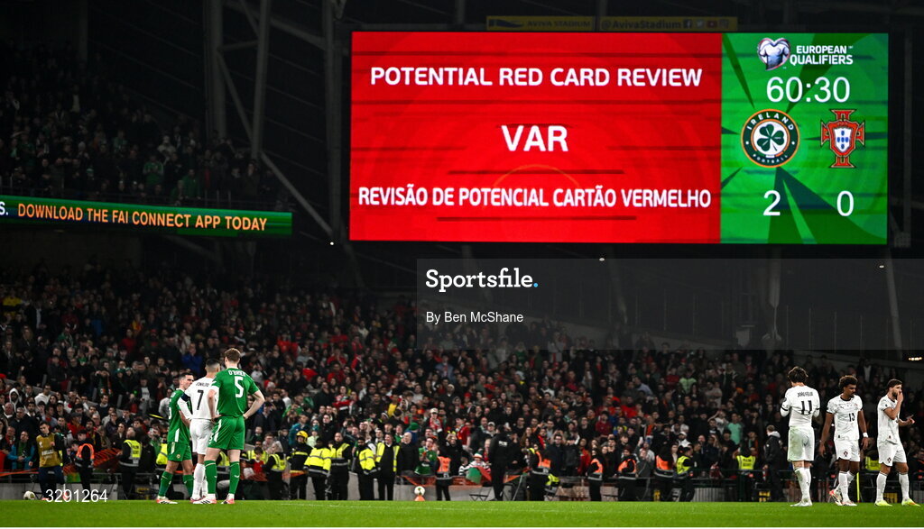13 November 2025; Cristiano Ronaldo of Portugal, 7, look on as the referee checks VAR before howing him a red card during the FIFA World Cup 2026 Group F Qualifier match between Republic of Ireland and Portugal at the Aviva Stadium in Dublin. Photo by Ben McShane/Sportsfile