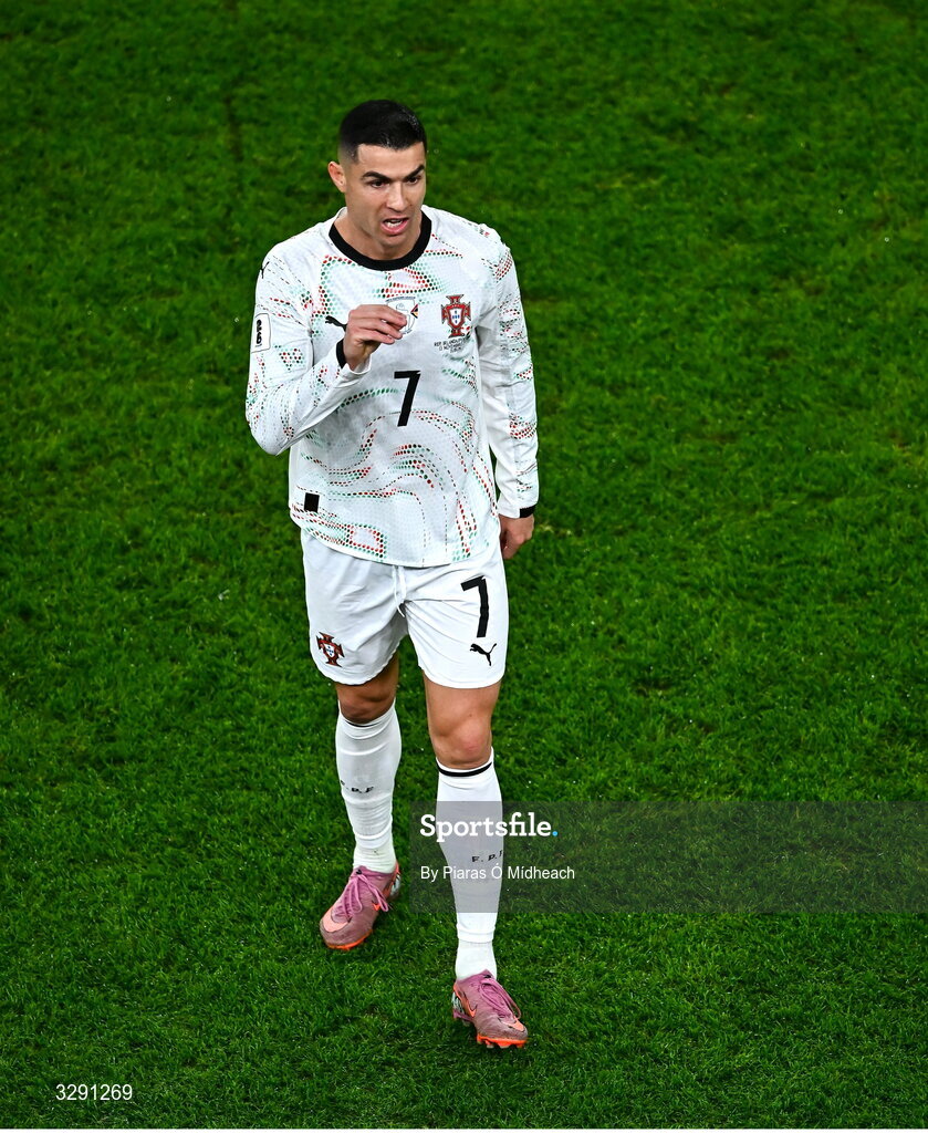 13 November 2025; Cristiano Ronaldo of Portugal gestures to the Republic of Ireland bench after being shown a red card during the FIFA World Cup 2026 Group F Qualifier match between Republic of Ireland and Portugal at the Aviva Stadium in Dublin. Photo by Piaras Ó Mídheach/Sportsfile