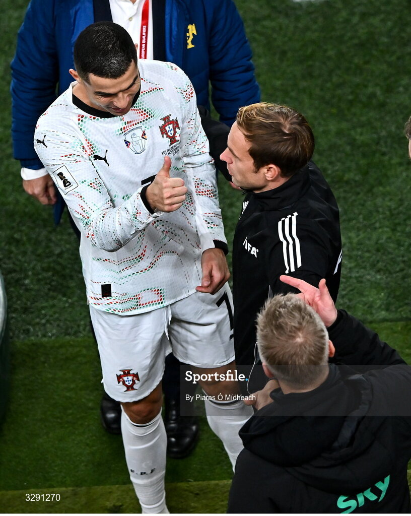 13 November 2025; Cristiano Ronaldo of Portugal gestures towards Republic of Ireland manager Heimir Hallgrimsson after being shown a red card during the FIFA World Cup 2026 Group F Qualifier match between Republic of Ireland and Portugal at the Aviva Stadium in Dublin. Photo by Piaras Ó Mídheach/Sportsfile