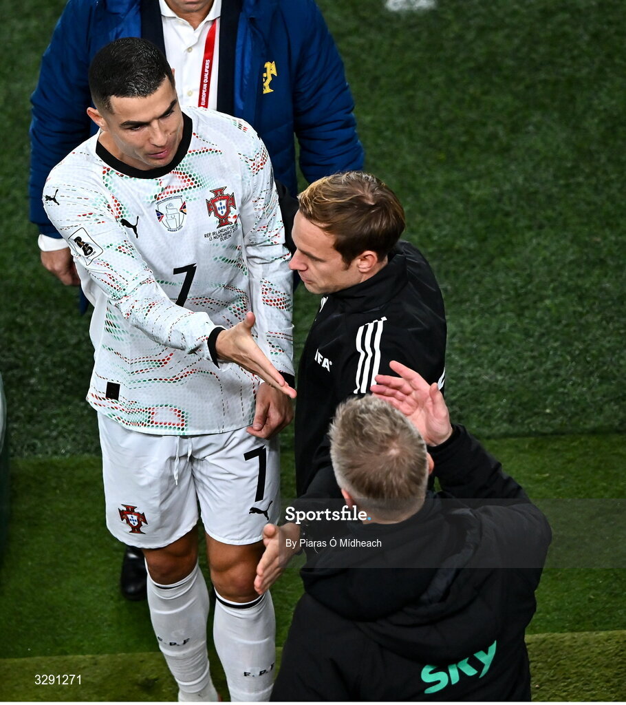 13 November 2025; Cristiano Ronaldo of Portugal gestures towards Republic of Ireland manager Heimir Hallgrimsson after being shown a red card during the FIFA World Cup 2026 Group F Qualifier match between Republic of Ireland and Portugal at the Aviva Stadium in Dublin. Photo by Piaras Ó Mídheach/Sportsfile