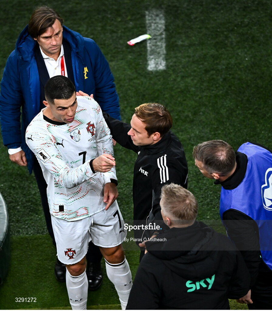 13 November 2025; Cristiano Ronaldo of Portugal gestures towards Republic of Ireland manager Heimir Hallgrimsson after being shown a red card during the FIFA World Cup 2026 Group F Qualifier match between Republic of Ireland and Portugal at the Aviva Stadium in Dublin. Photo by Piaras Ó Mídheach/Sportsfile