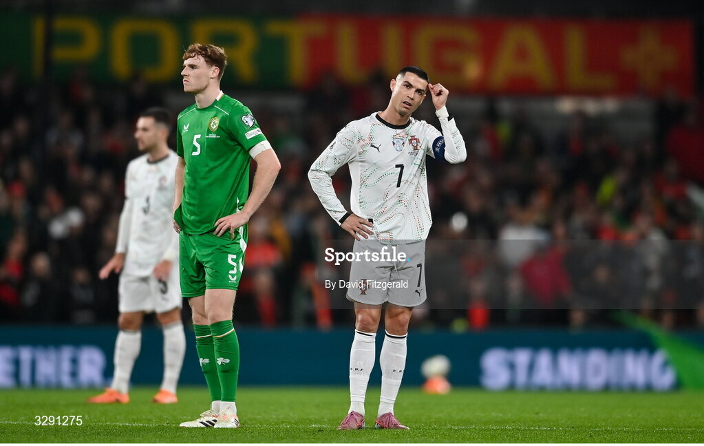 13 November 2025; Cristiano Ronaldo of Portugal reacts after being shown a red card during the FIFA World Cup 2026 Group F Qualifier match between Republic of Ireland and Portugal at the Aviva Stadium in Dublin. Photo by David Fitzgerald/Sportsfile