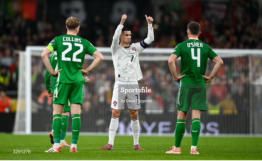13 November 2025; Cristiano Ronaldo of Portugal reacts after being shown a red card during the FIFA World Cup 2026 Group F Qualifier match between Republic of Ireland and Portugal at the Aviva Stadium in Dublin. Photo by David Fitzgerald/Sportsfile