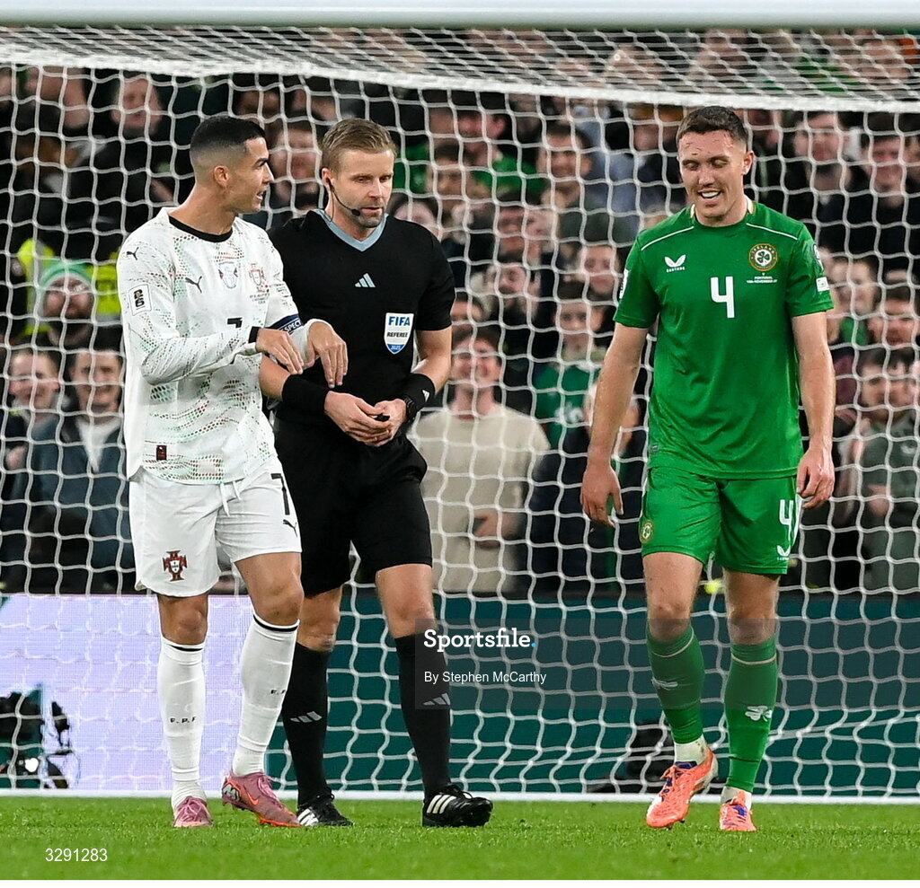 13 November 2025; Cristiano Ronaldo of Portugal and Dara O'Shea of Republic of Ireland with referee Glenn Nyber during the FIFA World Cup 2026 Group F Qualifier match between Republic of Ireland and Portugal at the Aviva Stadium in Dublin. Photo by Stephen McCarthy/Sportsfile
