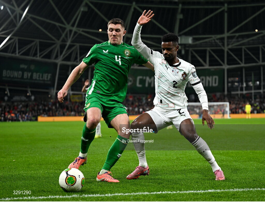 13 November 2025; Dara O'Shea of Republic of Ireland in action against Nélson Semedo of Portugal during the FIFA World Cup 2026 Group F Qualifier match between Republic of Ireland and Portugal at the Aviva Stadium in Dublin. Photo by David Fitzgerald/Sportsfile