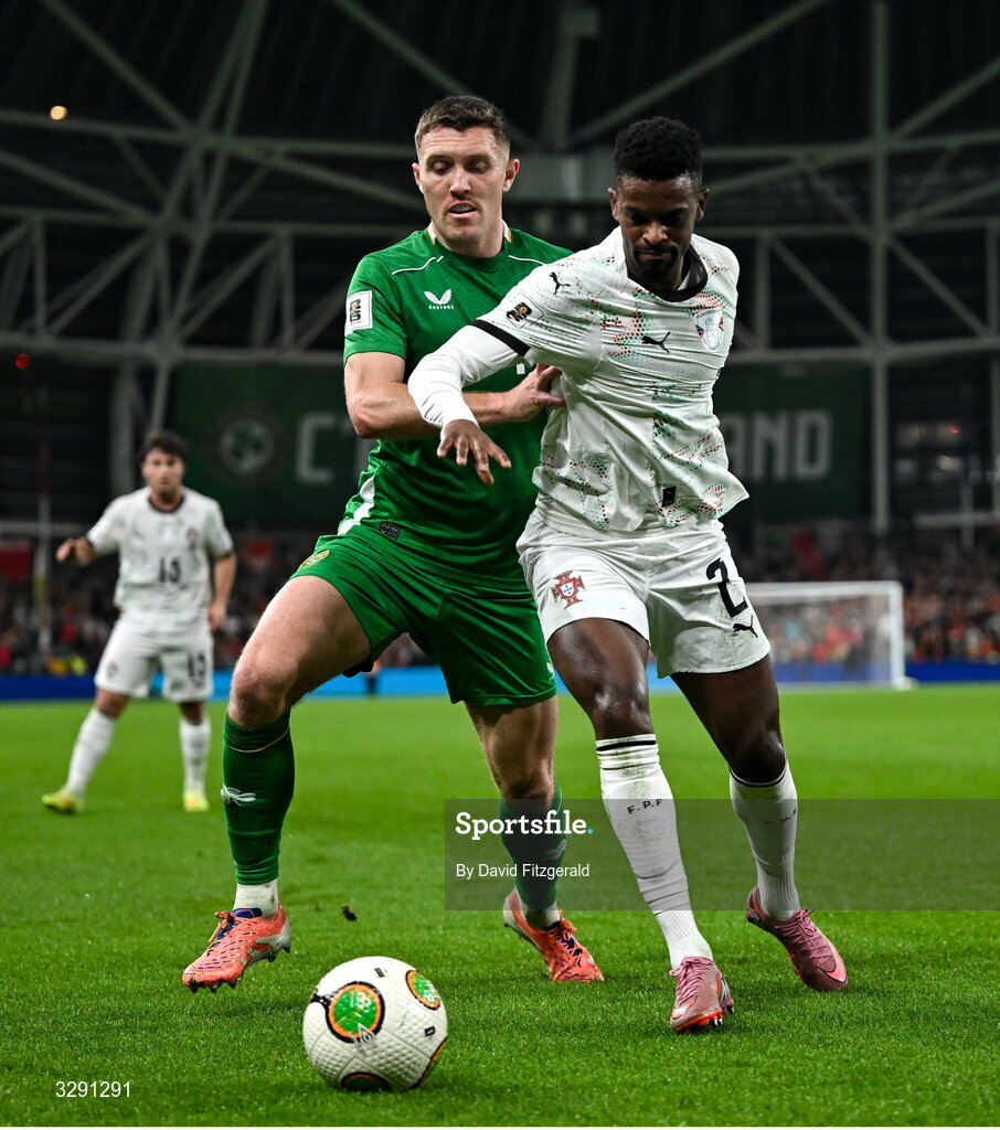 13 November 2025; Dara O'Shea of Republic of Ireland in action against Nélson Semedo of Portugal during the FIFA World Cup 2026 Group F Qualifier match between Republic of Ireland and Portugal at the Aviva Stadium in Dublin. Photo by David Fitzgerald/Sportsfile