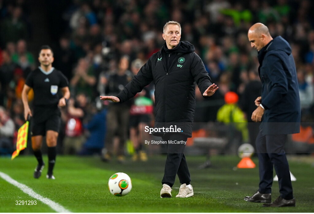 13 November 2025; Republic of Ireland head coach Heimir Hallgrimsson, left, and Portugal head coach Roberto Martínez during the FIFA World Cup 2026 Group F Qualifier match between Republic of Ireland and Portugal at the Aviva Stadium in Dublin. Photo by Stephen McCarthy/Sportsfile