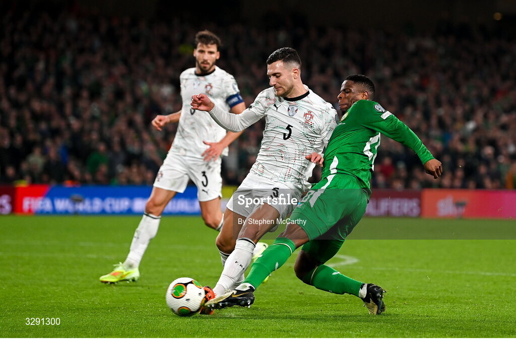13 November 2025; Chiedozie Ogbene of Republic of Ireland in action against Diogo Dalot of Portugal during the FIFA World Cup 2026 Group F Qualifier match between Republic of Ireland and Portugal at the Aviva Stadium in Dublin. Photo by Stephen McCarthy/Sportsfile
