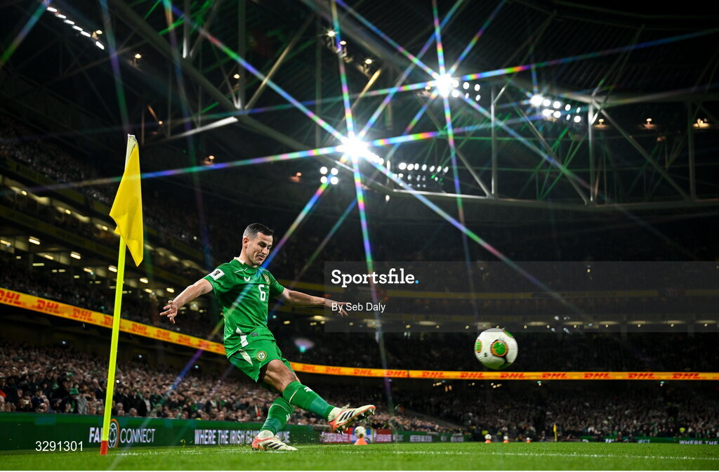 13 November 2025; (EDITOR'S NOTE; This image was created using a special effects camera filter) Josh Cullen of Republic of Ireland takes a corner kick during the FIFA World Cup 2026 Qualifier match between Republic of Ireland and Portugal at the Aviva Stadium in Dublin. Photo by Seb Daly/Sportsfile