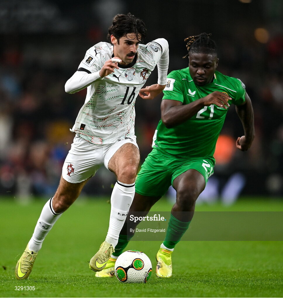 13 November 2025; Francisco Trincao of Portugal in action against Festy Ebosele of Republic of Ireland during the FIFA World Cup 2026 Group F Qualifier match between Republic of Ireland and Portugal at the Aviva Stadium in Dublin. Photo by David Fitzgerald/Sportsfile