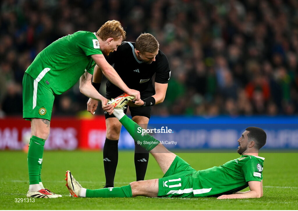 13 November 2025; Finn Azaz of Republic of Ireland is helped by teammate Liam Scales, left, during the FIFA World Cup 2026 Group F Qualifier match between Republic of Ireland and Portugal at the Aviva Stadium in Dublin. Photo by Stephen McCarthy/Sportsfile