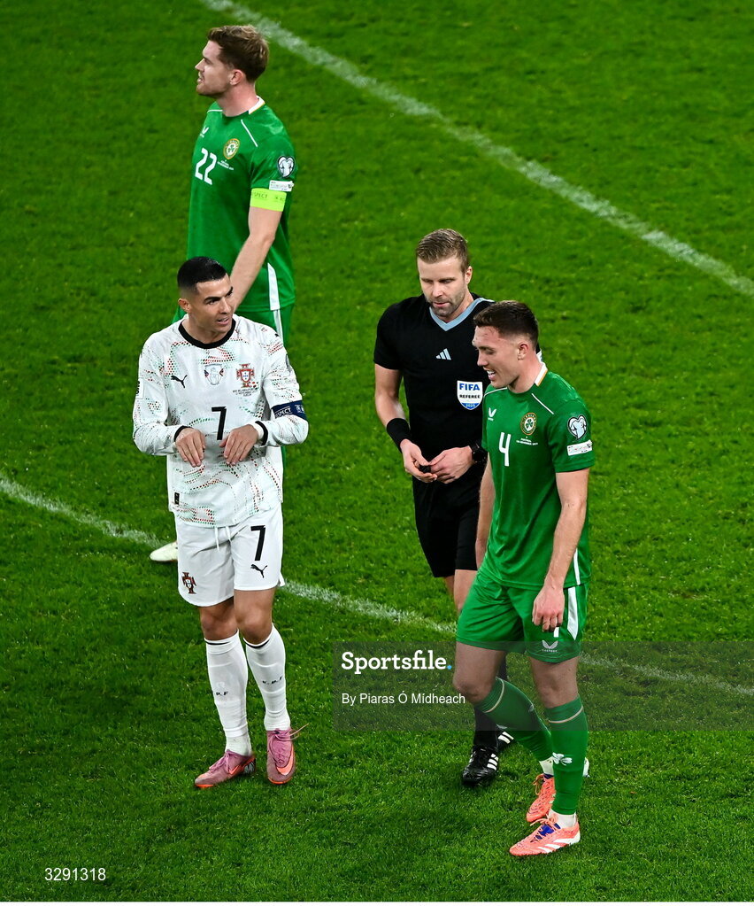 13 November 2025; Cristiano Ronaldo of Portugal gestures towards Dara O'Shea of Republic of Ireland, in the company of referee Glenn Nyber, before being shown a red card during the FIFA World Cup 2026 Group F Qualifier match between Republic of Ireland and Portugal at the Aviva Stadium in Dublin. Photo by Piaras Ó Mídheach/Sportsfile