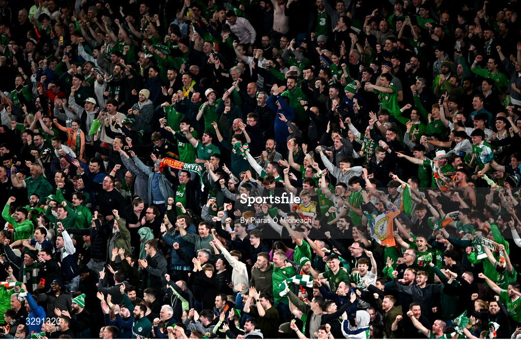 13 November 2025; Republic of Ireland supporters celebrate after the FIFA World Cup 2026 Group F Qualifier match between Republic of Ireland and Portugal at the Aviva Stadium in Dublin. Photo by Piaras Ó Mídheach/Sportsfile