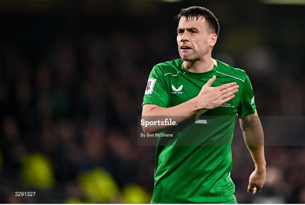 13 November 2025; Seamus Coleman of Republic of Ireland celebrates after the FIFA World Cup 2026 Group F Qualifier match between Republic of Ireland and Portugal at the Aviva Stadium in Dublin. Photo by Ben McShane/Sportsfile