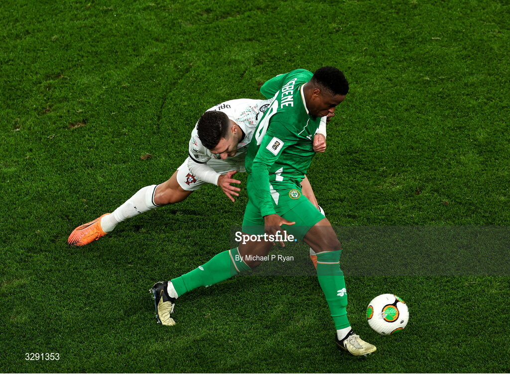 13 November 2025; Ogbene of Republic of Ireland in action against Diogo Dalot of Portugal during the FIFA World Cup 2026 Group F Qualifier match between Republic of Ireland and Portugal at the Aviva Stadium in Dublin. Photo by Michael P Ryan/Sportsfile